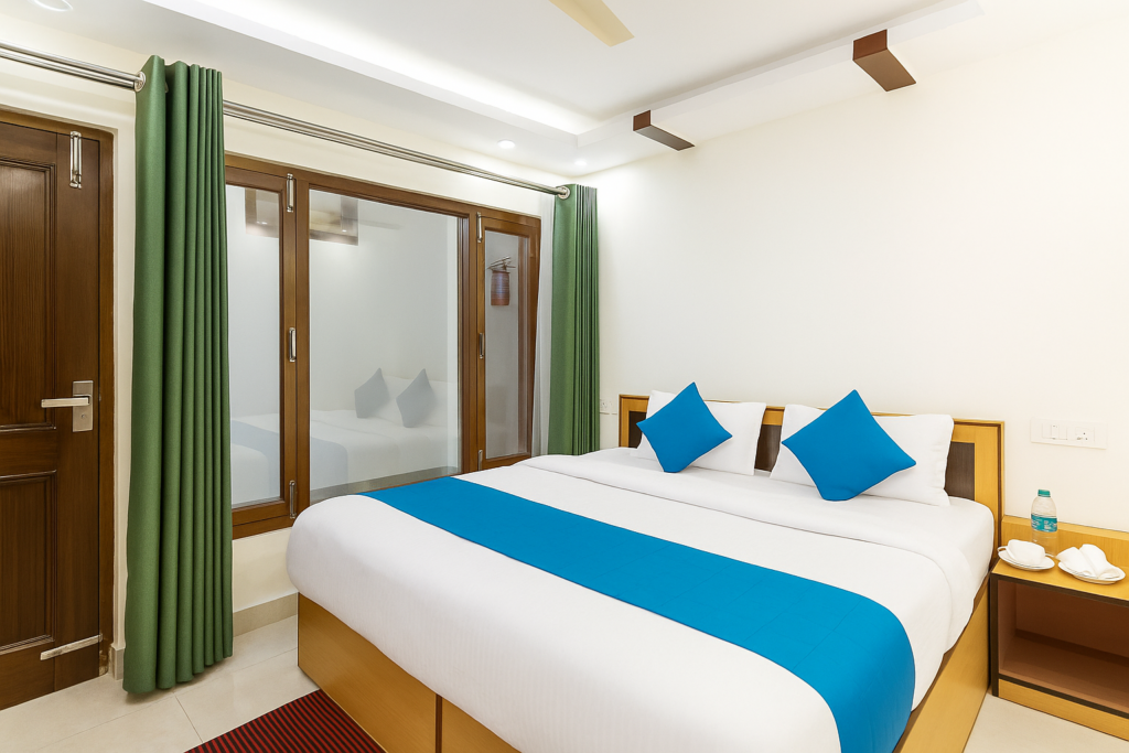 Our rooftop restaurant serves carefully prepared 100% pure veg cuisine, perfect for families, couples, and guests who prefer a clean and vegetarian-friendly dining experience. Whether it’s a hearty breakfast, leisurely lunch, or romantic dinner under the stars, every moment here is memorable.
